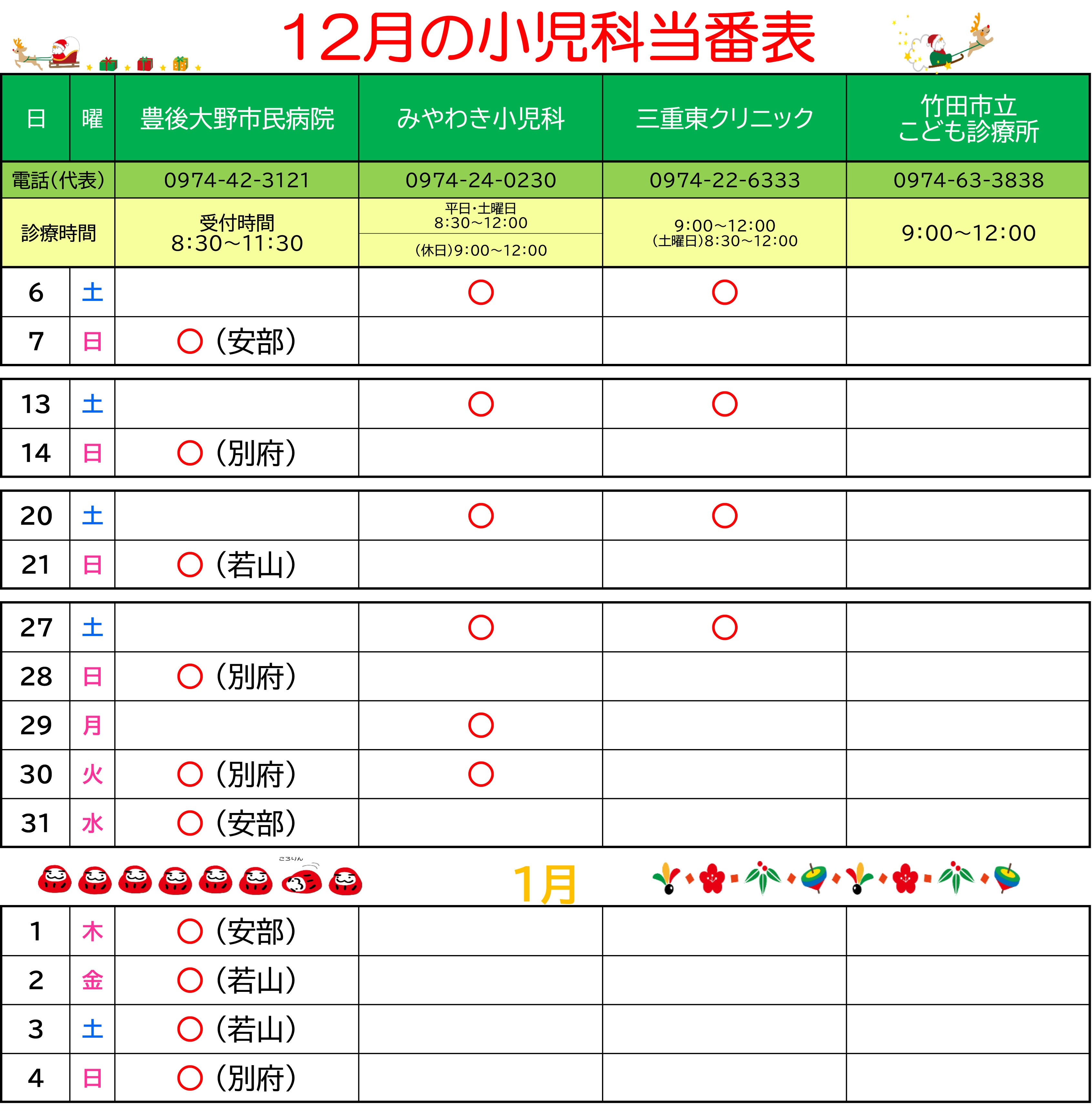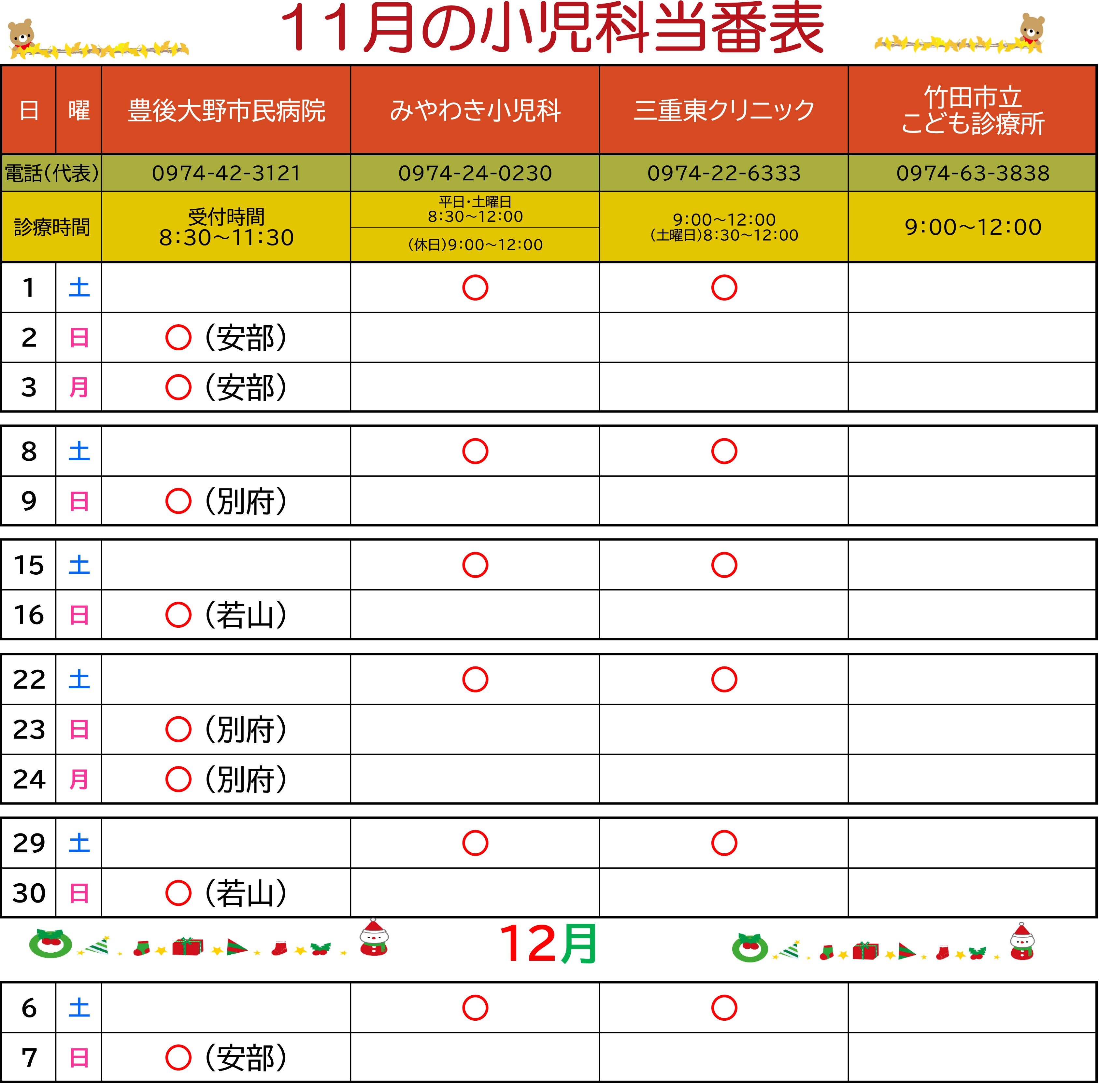 豊肥地区の休日の小児科当番病院の診療時間は土・日・祝日ともに下記のとおりです。